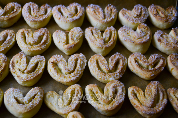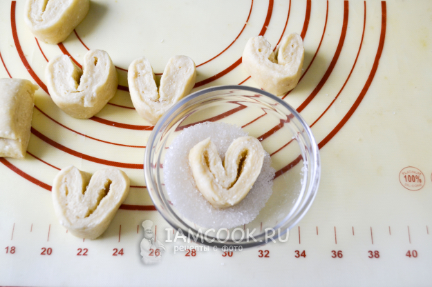 Расправьте кусочки так, чтобы они приняли вид сердечек. Обмакните получившиеся сердечки одной стороной в сахар.