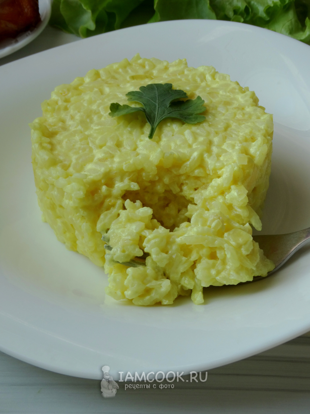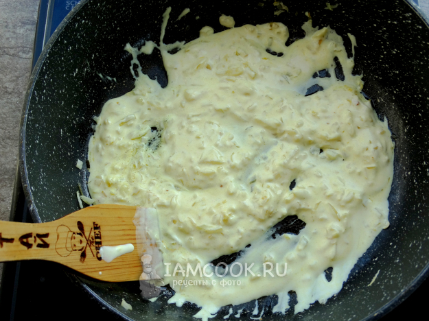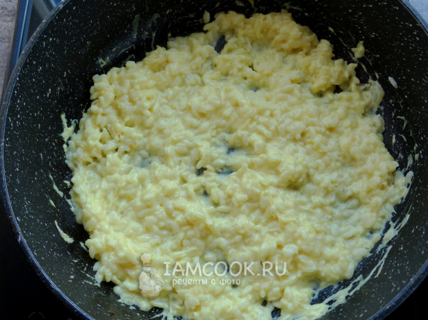 Перемешать и прогреть рис в сметанном соусе на сковороде буквально 30 секунд.