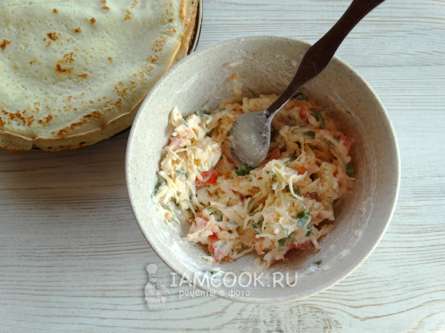 Перемешать начинку со сметаной. Если требуется - подсолить.