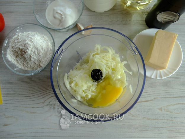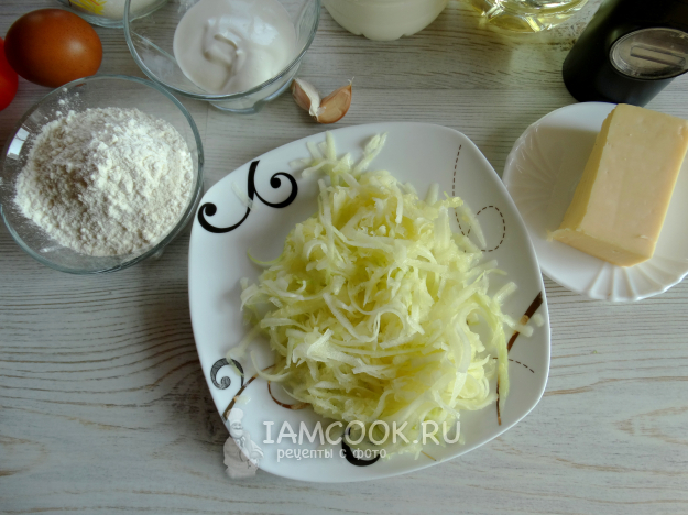 Для начинки натереть на мелкой тёрке сыр и чеснок, нарезать помидор, я добавила еще немного рубленой петрушки.