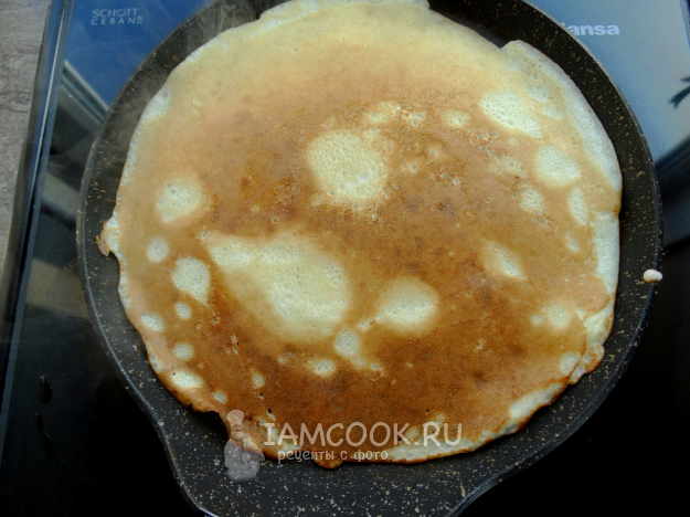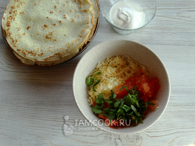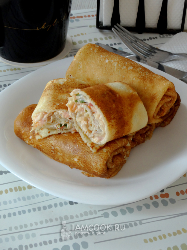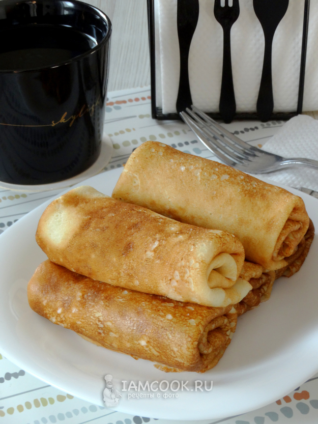 Испечь тонкие блинчики привычным способом.
