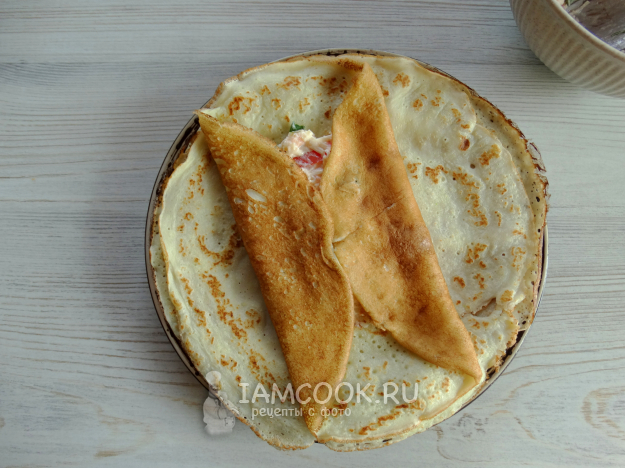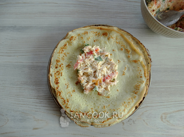 В центр блина выложить пару ложек начинки.