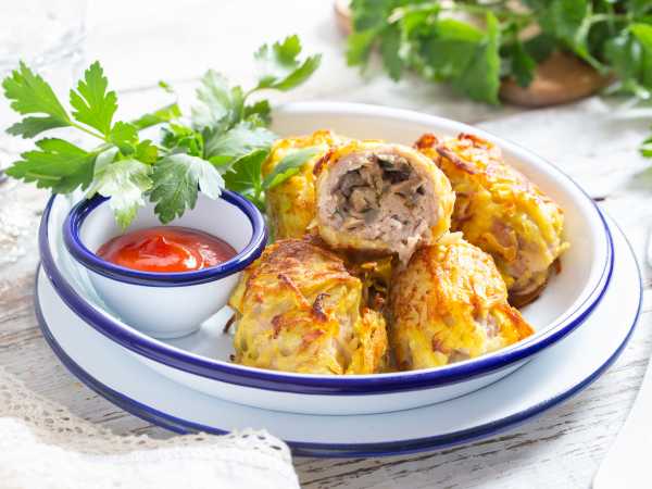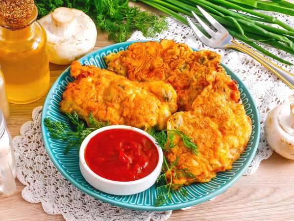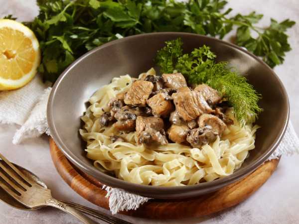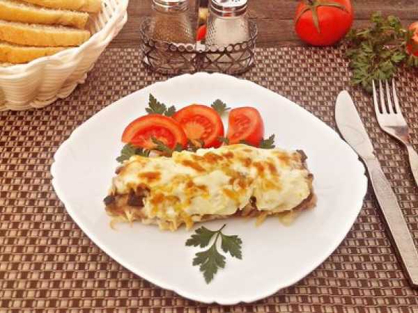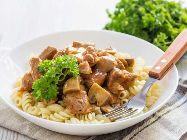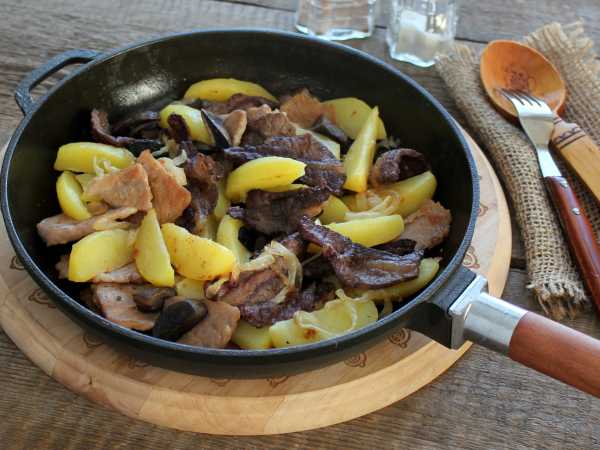 Куски мяса и шампиньоны должны быть соизмеримы по размеру.