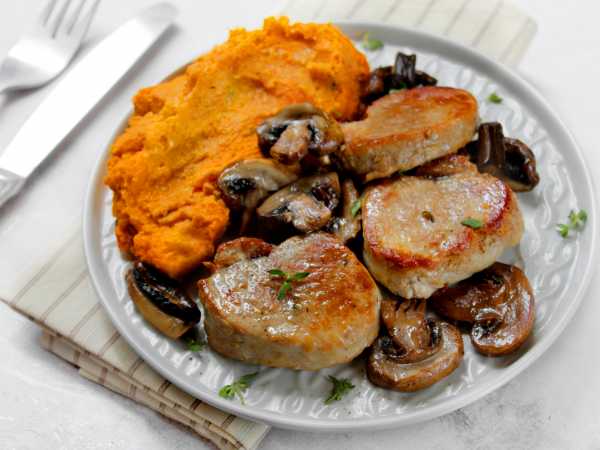 Подготовьте все необходимые продукты для запекания свиной шеи с шампиньонами в духовке.