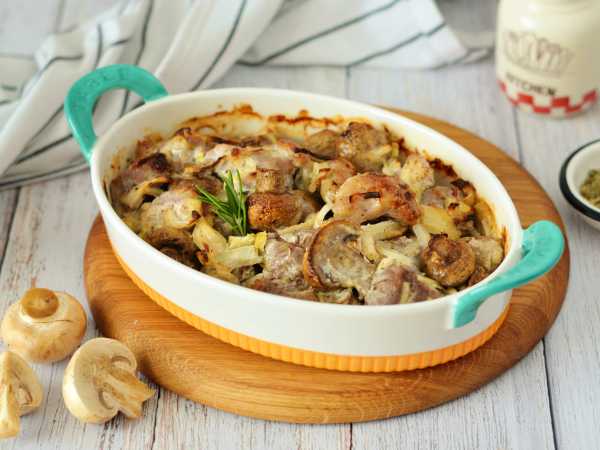 Выложите мясо с грибами в форму для запекания и отправьте в нагретую духовку.