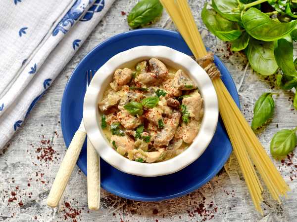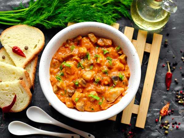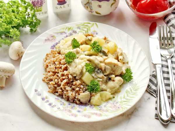 В отдельной миске смешайте до однородной консистенции сливки с мукой. Залейте курицу с грибами сливками, добавьте мускатный орех. Доведите соус до кипения, уменьшите огонь, тушите еще 3-5 минут, пока он не загустеет.