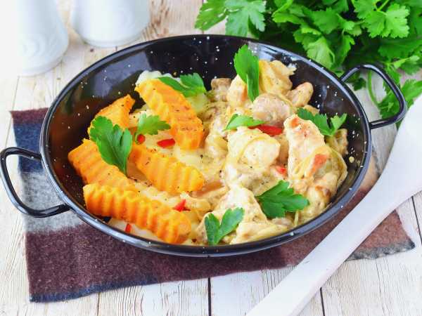 Выключите огонь и дайте курице с лисичками в сливочном соусе настояться пару минут под крышкой. Перед подачей посыпьте мелко нарезанной петрушкой.