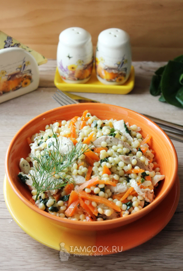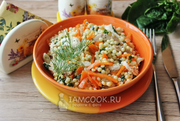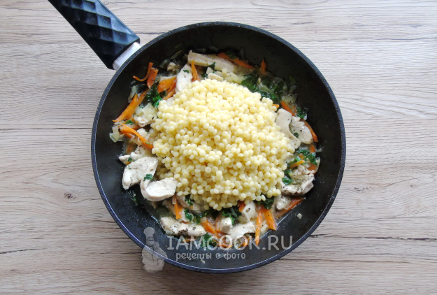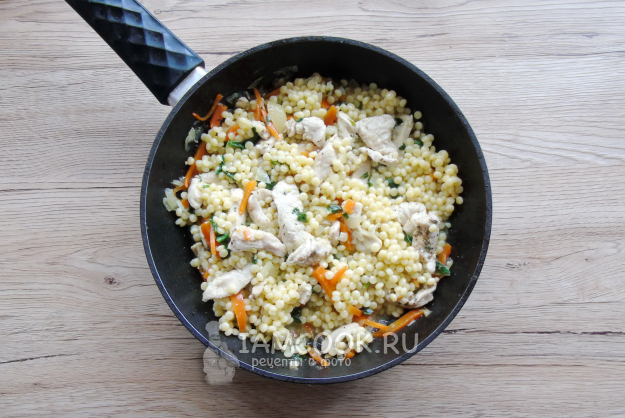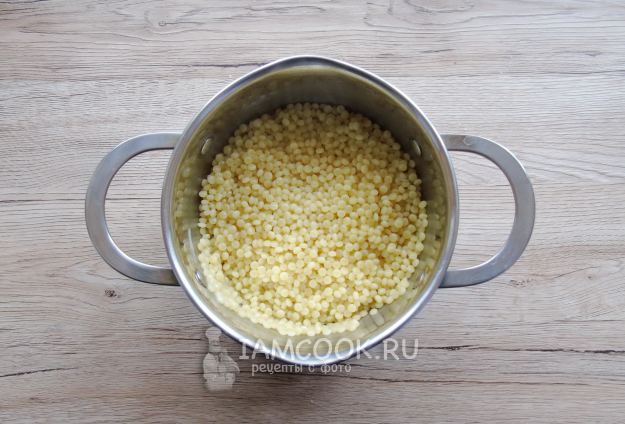 Воду в кастрюле вскипятите и немного посолите. Добавьте птитим и варите его до готовности. После откиньте на дуршлаг.