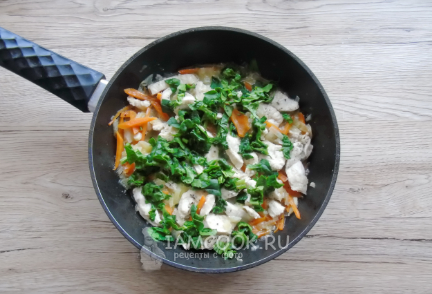 Готовьте курицу с овощами 7-8 минут, периодически перемешивая. После добавьте нарезанный шпинат, который нужно предварительно хорошо промыть. Прогрейте блюдо еще 2-3 минуты и выключайте плиту.