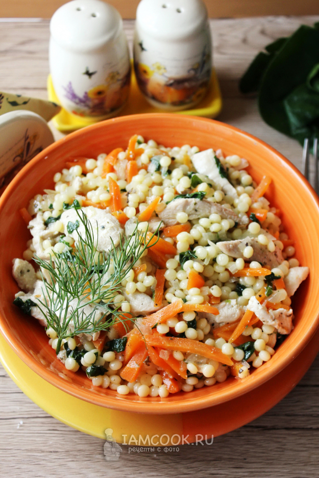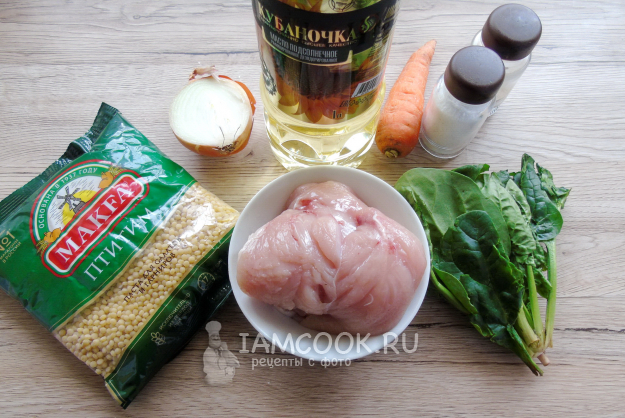 Соберите ингредиенты для приготовления птитима с курицей и шпинатом.