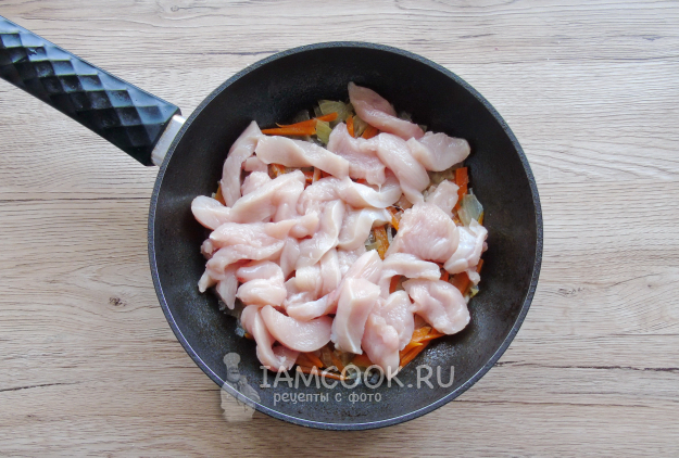 Куриное филе помойте и нарежьте небольшими кусочками произвольно. Я нарезала полосками. Добавьте к моркови и луку. Посолите и поперчите по вкусу.