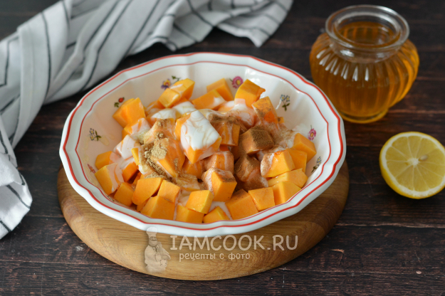 Сложите кусочки тыквы в миску, добавьте кефир и пряности. Полейте мёдом и лимонным соком.