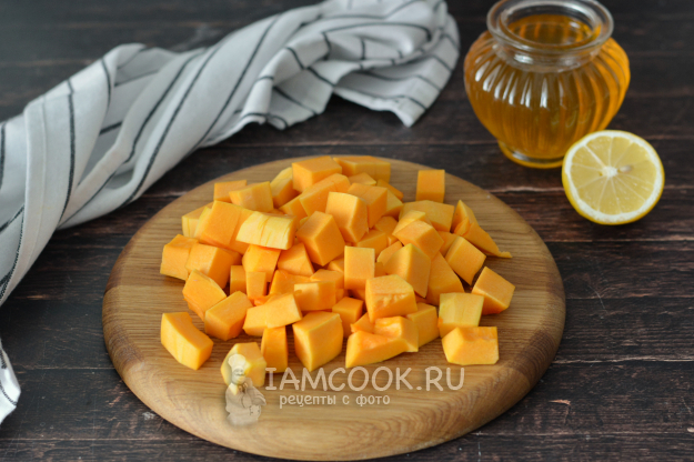 Тыкву очистите от шкурки и семян и нарежьте на кусочки примерно 2х2 или 3х3 сантиметра.