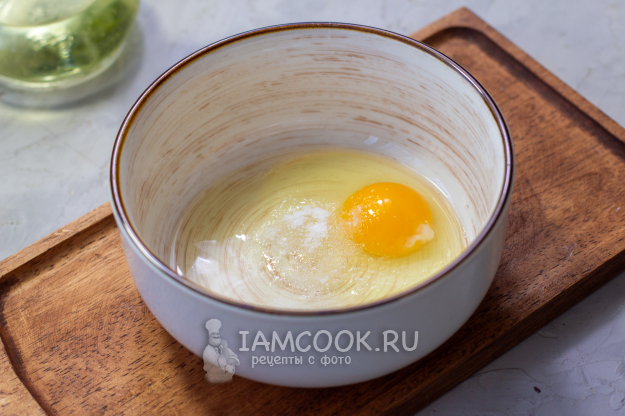 В небольшую подходящую посуду вбейте куриное яйцо категории С1, добавьте соль и немного сахара (буквально щепотку). Я сахар заменила 2 граммами сахарозаменителя "Стевия". Соедините продукты венчиком.