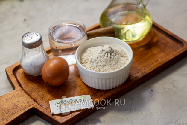 Соберите необходимые продукты для приготовления блинов из муки зеленой гречки на воде.