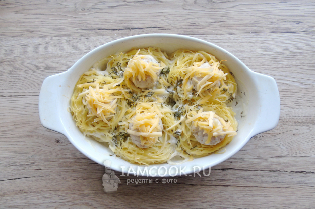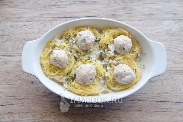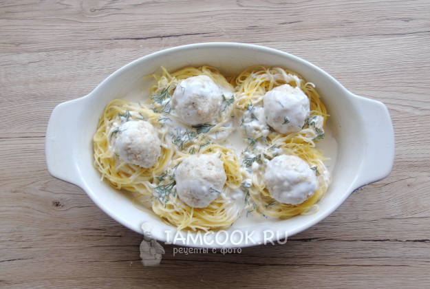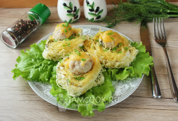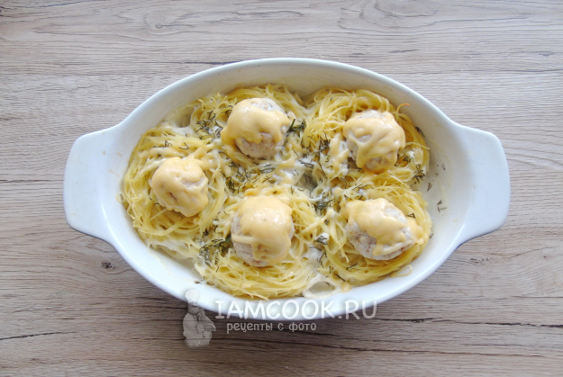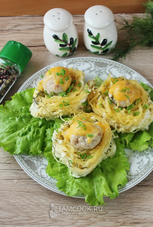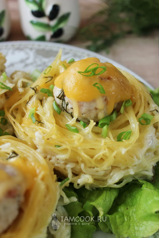 Фрикадельки с макаронными гнездами готовы.