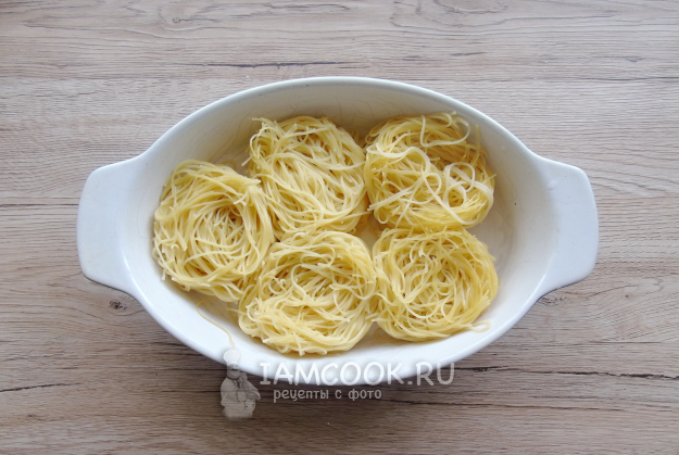 Макароны-гнезда также отварите в подсоленной воде 3-4 минуты. Затем выложите в форму для запекания.