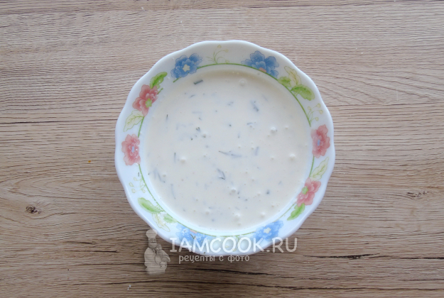 Приготовьте заливку. В мисочке перемешайте сметану, нарезанный мелко укроп и 180-200 мл воды. Посолите по вкусу.