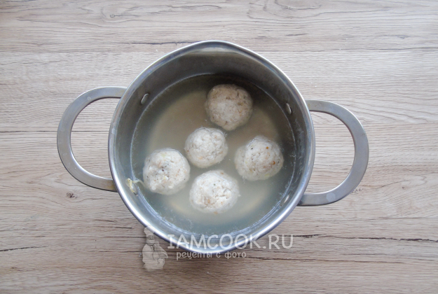 Из фарша сформируйте фрикадельки и выложите в кастрюлю с подсоленной кипящей водой. Варите 3-4 минуты с момента закипания.