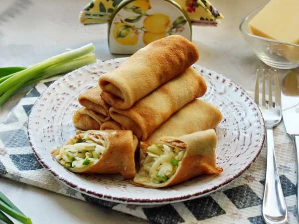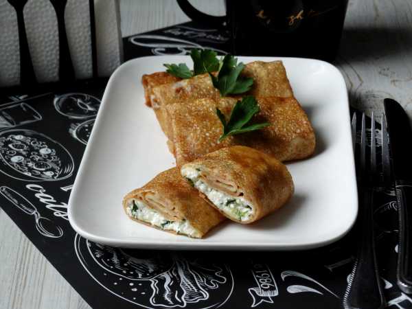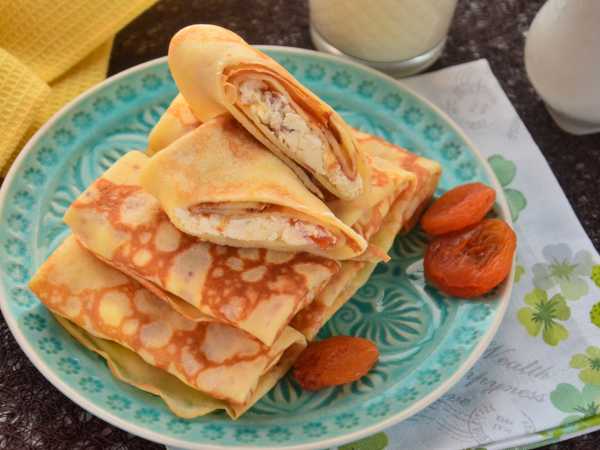 Осталось только завернуть начинку в блинчики. На верхний блин выложите 1,5-2 ст.л. творожно-кокосовой массы и равномерно распределите ее по блину, отступив от краев 2-3 см.