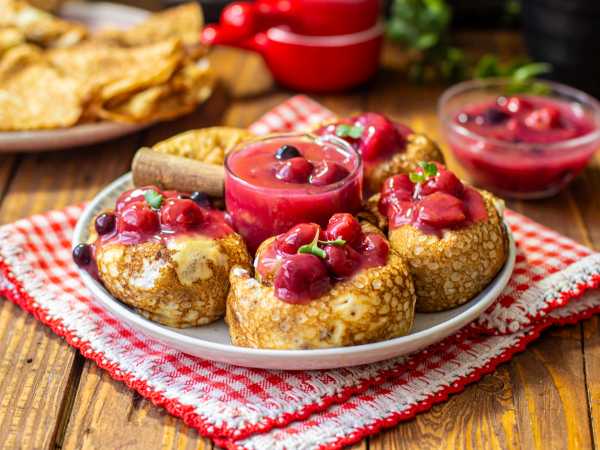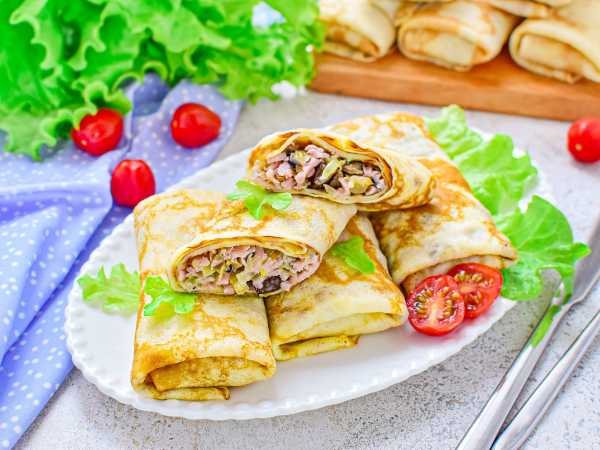 Сверните блин трубочкой по направлению к расправленному краю или сложите конвертиком.