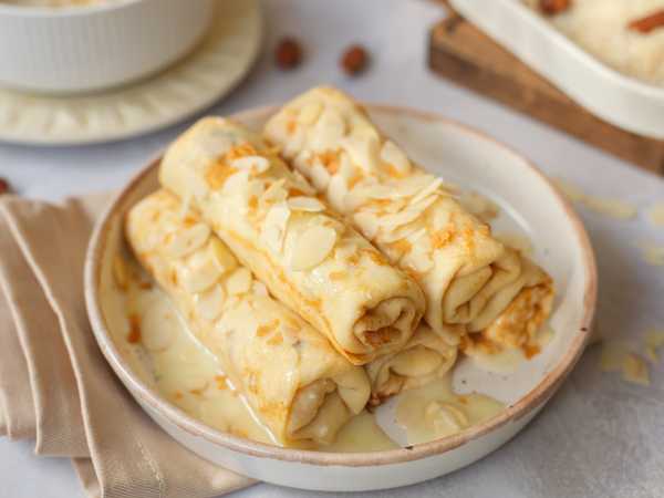 Выложите блинчики «Рафаэлло» на тарелку, полейте сгущенкой и посыпьте миндальными лепестками или рубленым миндалем. Я дополнительно украсила десерт хрустящей вафельной крошкой, но если у вас ее нет, бежать в магазин за ней не нужно, и так получится вкусно и нежно.