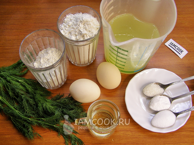 Подготовим продукты для блинов на сыворотке с укропом. Сыворотку и яйца заранее достаём из холодильника, чтобы всё прогрелось до комнатной температуры. Можно слегка подогреть сыворотку на плите примерно до 30-40 градусов.