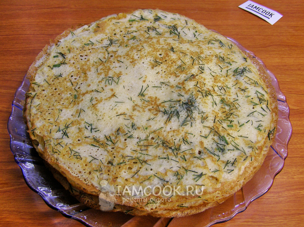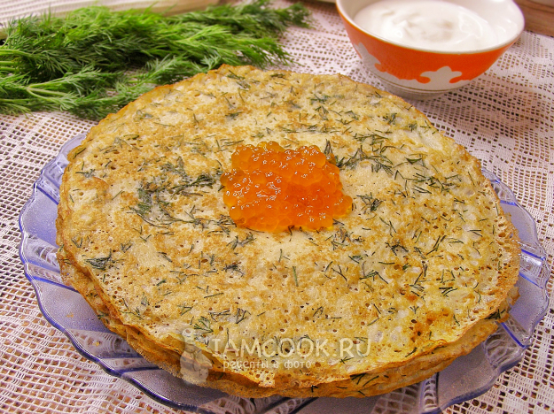 Приготовленные блины на сыворотке с укропом перекладываем на тарелку один на другой. По желанию можно каждый смазать кусочком сливочного масла.