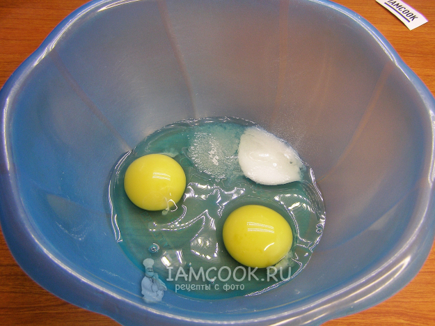 В отдельную миску разбиваем яйца, добавляем в них соль, сахар и размешиваем, чтобы соль и сахар растворились.