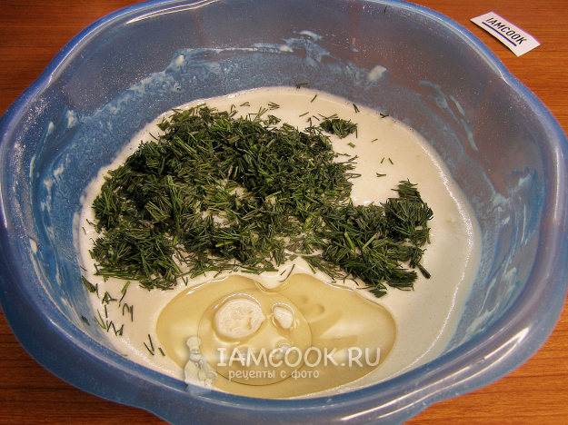 Добавляем в тесто 2 столовые ложки подсолнечного масла и мелко нарезанный укроп. Перемешиваем и оставляем тесто минут на 10-15, чтобы мука впитала в себя жидкость и тесто получилось нужной консистенции. Оно должно быть похожим на кефир или жидкую сметану. Если тесто густое, можно добавить ещё немного сыворотки или прохладной кипячёной воды. Если жидкое - добавляем чуточку муки.
