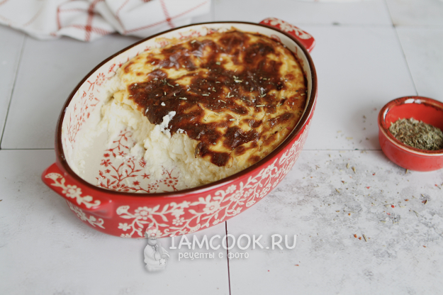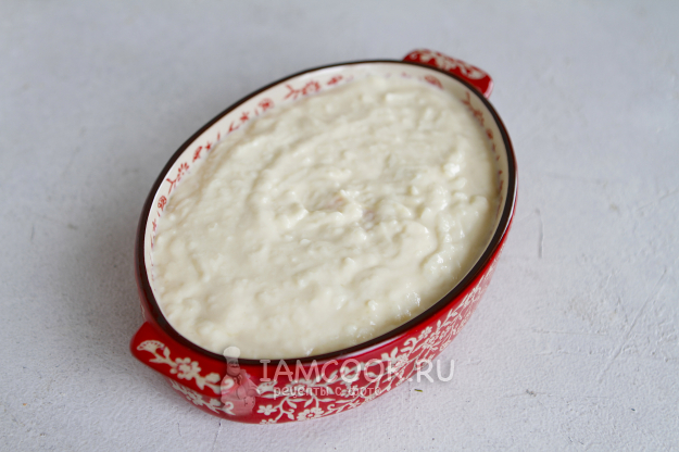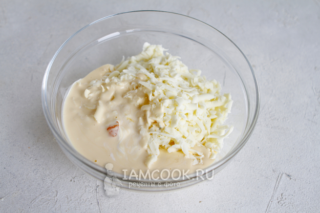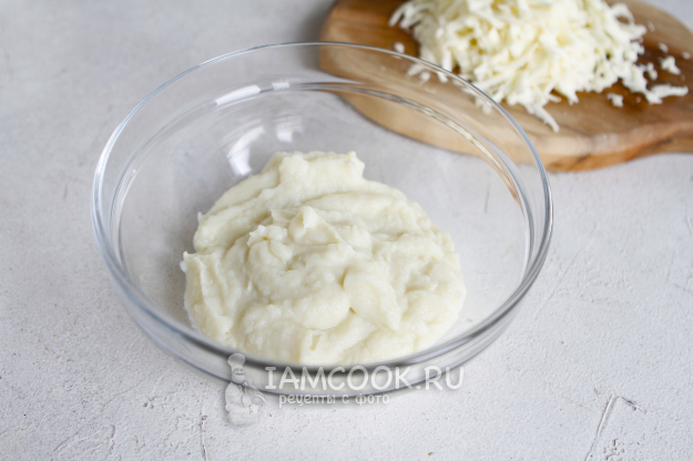 В пюре добавить сыр и яйца со сливками. Тщательно все ингредиенты перемешать.