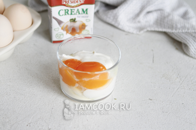 В небольшой чаше взбить сливки и куриные желтки (можно добавить просто яйцо целиком).