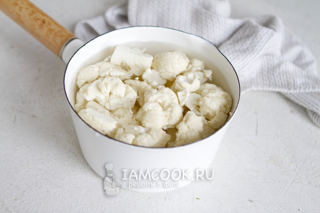 В сотейнике вскипятите воду, после закипания посолите. Забросьте соцветия цветной капусты и отварите ее до мягкости (примерно 6-8 минут).