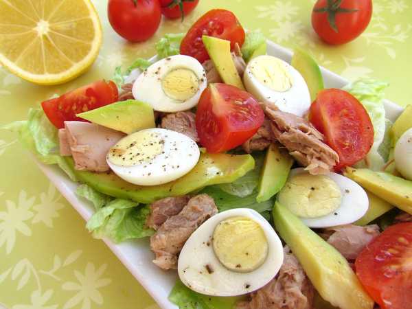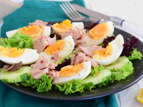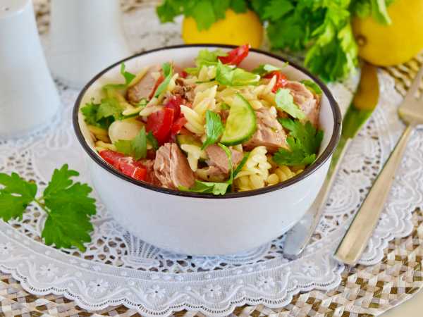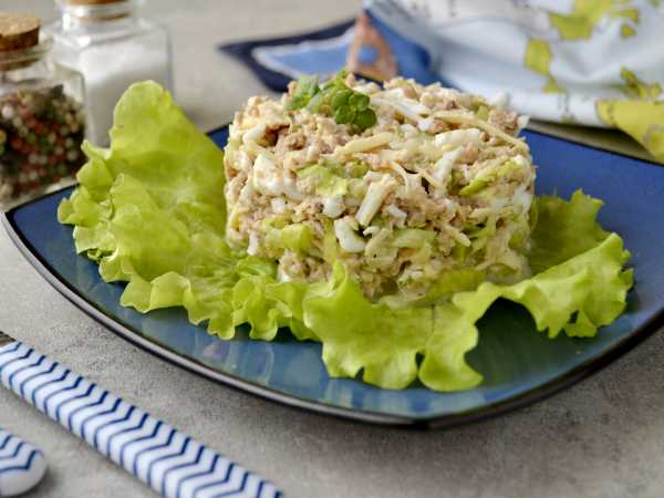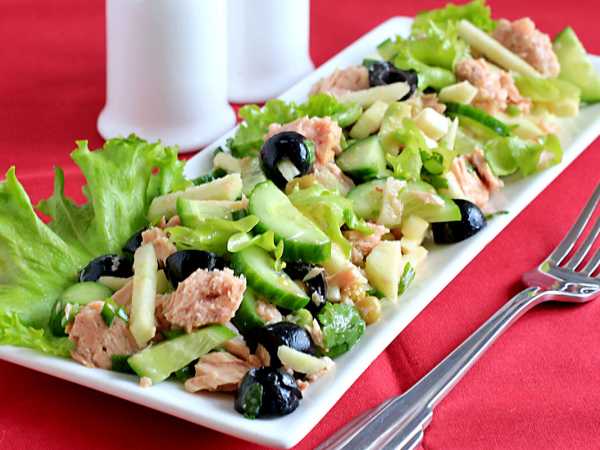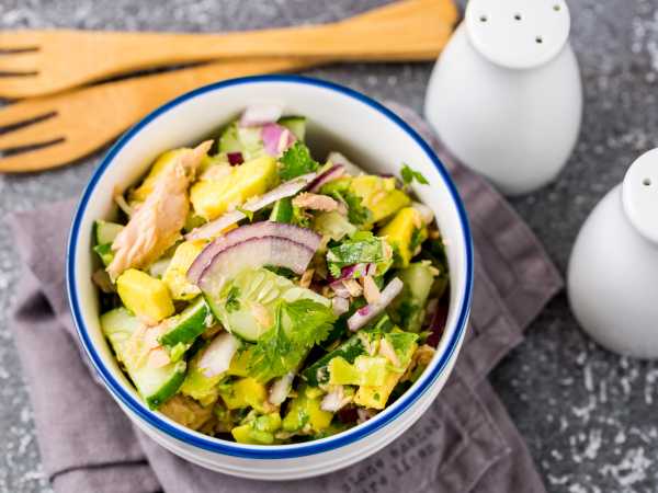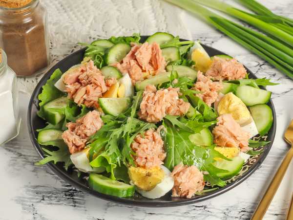 Добавить масло, соль, перец и тунца, сбрызнуть салат лимонным соком и перемешать.