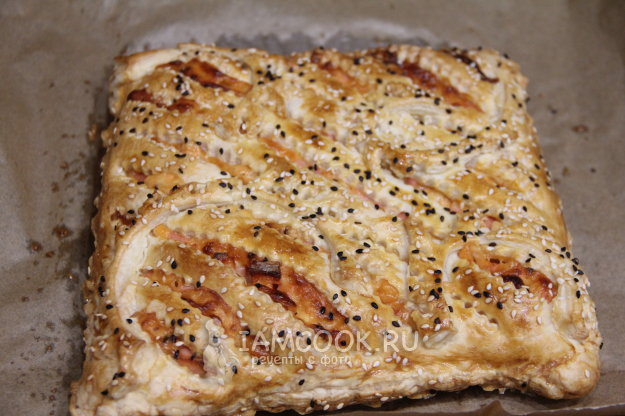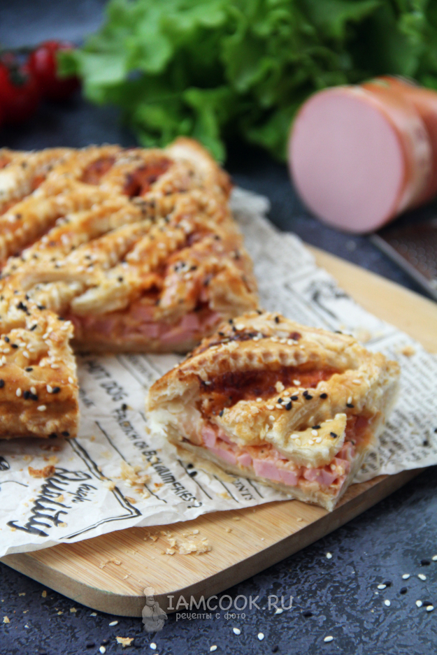 Выпекать пирог из слоеного теста с колбасой и сыром при 220 градусах в разогретой заранее духовке примерно 30 минут.