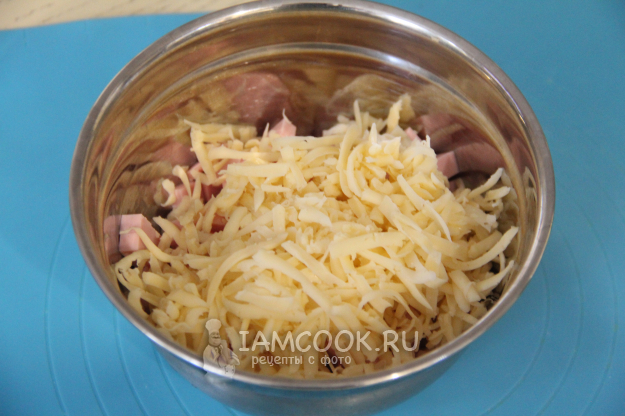 Сыр натереть на терке и добавить в миску к колбасе.
