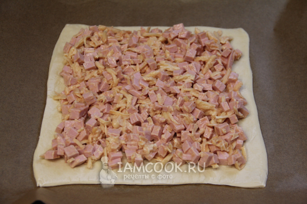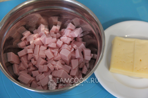 Пока тесто размораживается, приготовить начинку. Колбасу очистить от слюды и нарезать на кубики примерно 5 мм.