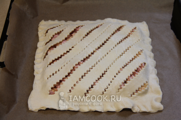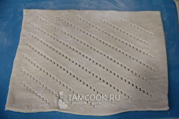 Второй пласт теста слегка раскатать и сделать разрезы ножом или рифленым ножом.