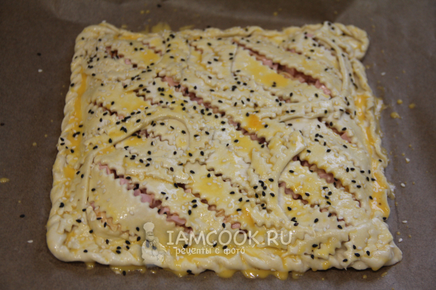 Смазать пирог взбитым желтком и по желанию присыпать кунжутом или маком.