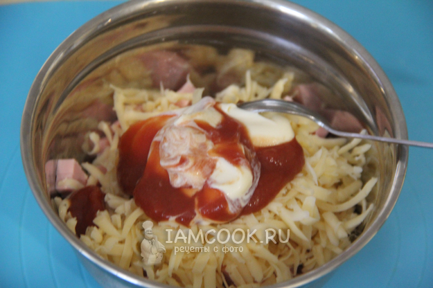 Затем добавить в начинку кетчуп и майонез.