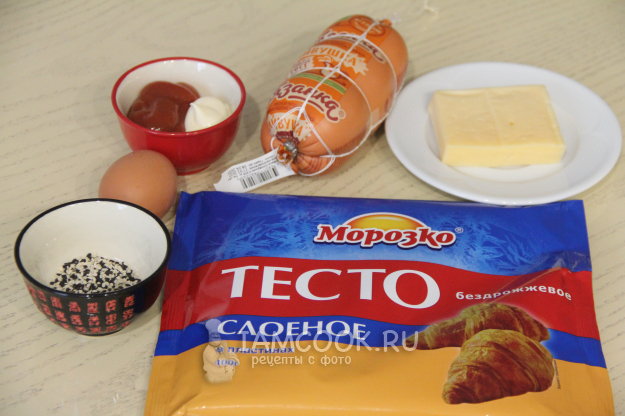 Подготовить продукты для пирога из слоеного теста с колбасой и сыром. Тесто разморозить при комнатной температуре.