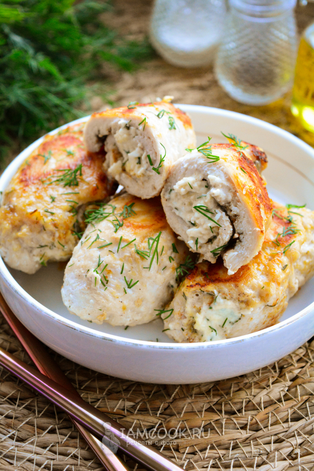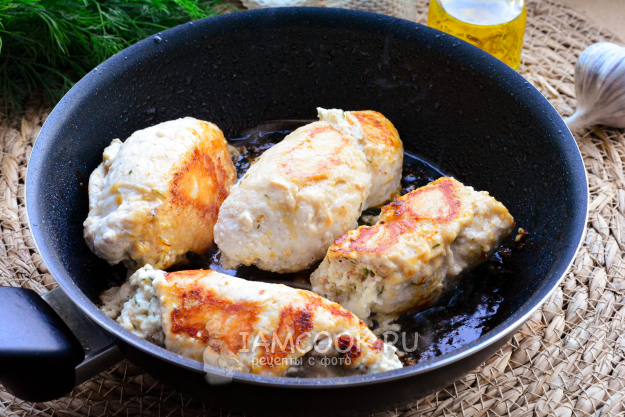 Жарьте куриные рулетики со всех сторон по 5-8 минут на среднем огне. Затем убавьте огонь до минимума, влейте пару ложек воды, прикройте сковороду крышкой и тушите блюдо 15-20 минут, до готовности.