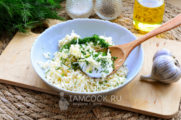 Плавленый сыр натрите на средней или мелкой терке, добавьте к нему немного майонеза, чтобы начинку было легче перемешивать. Майонез можете заменить сметаной.