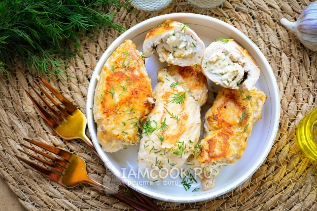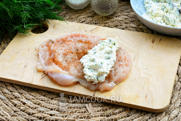 На край куриной отбивной выложите 1-1,5 ч. л. сырной начинки.