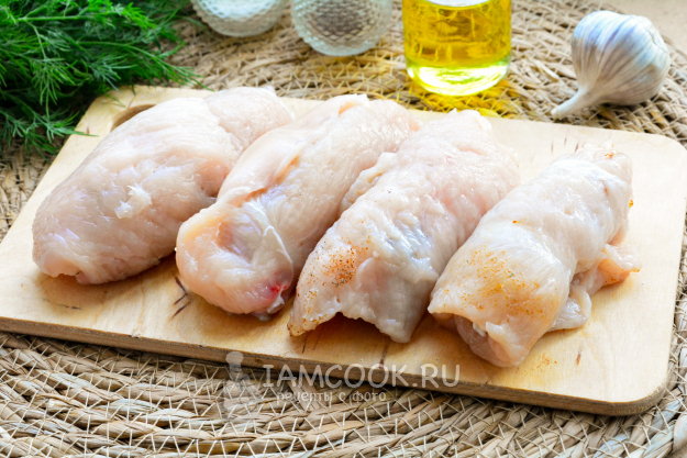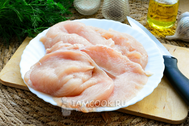 Куриное филе нарежьте вдоль на тонкие пластины, чтобы из них получилось свернуть рулетики.