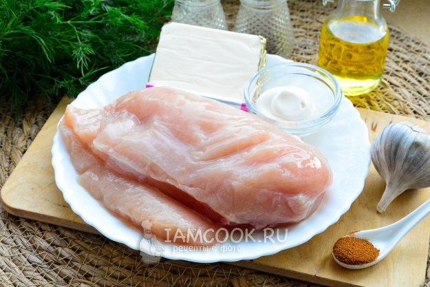 Соберите все ингредиенты для приготовления куриных рулетиков с плавленым сыром.