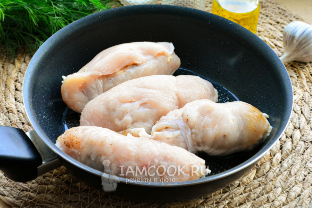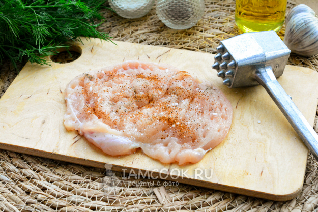 Куриное мясо отбейте, добавьте специи - соль, черный молотый перец и сладкую паприку по вкусу.