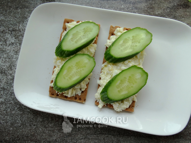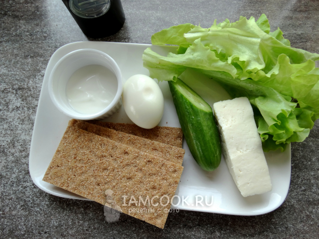 Приготовить ингредиенты для бутербродов из хлебцев с яйцом, огурцом и адыгейским сыром.