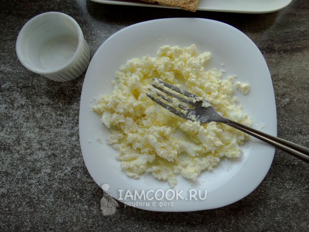 Добавить к сыру и яйцу сметану, немного подсолить и перемешать.