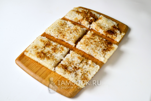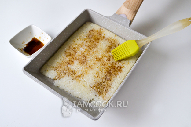 Хорошо разогрейте сковороду с растительным маслом. Выложите рис слоем примерно 4-5 мм, разровняйте лопаткой. Сковороду можно использовать любую привычную нам - круглую, не обязательно прямоугольную. Главное, чтобы она была с хорошим антипригарным покрытием.